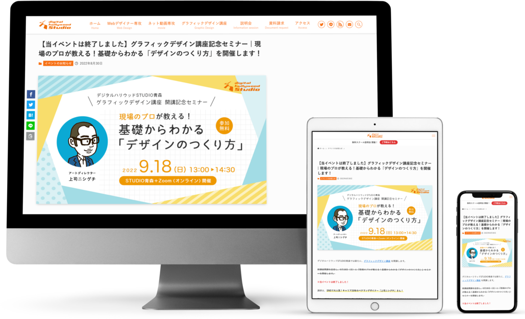 スクールの受講生に限らず、デザインに興味がある一般の方々に当セミナーを広く知っていただくため、ブログでの周知用のアイキャッチバナー(1280×720px)、ネット広告プロモーション用バナー2サイズ(1200×628px、300×300px)を制作しました。